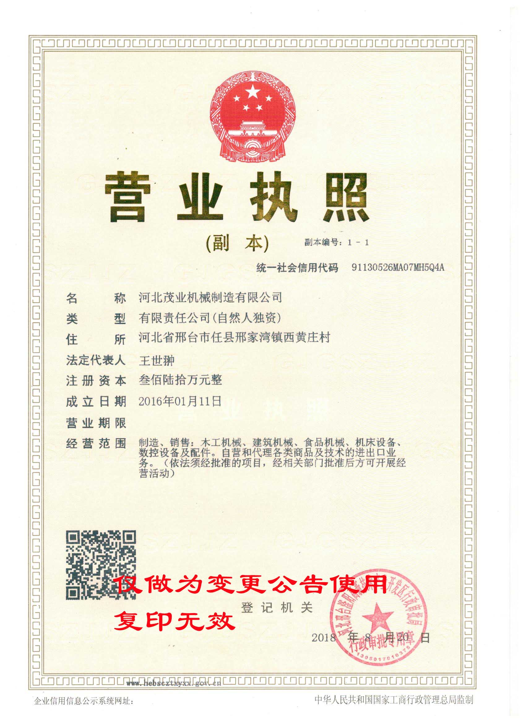 我司邢臺茂業(yè)機械制造有限公司,因公司業(yè)務發(fā)展的需要,現(xiàn)已整體變更為河北茂業(yè)機械制造有限公司,并于2018年8月20日取得河北邢臺滏陽高新技術(shù)產(chǎn)業(yè)開發(fā)區(qū)審批局頒發(fā)的營業(yè)執(zhí)照?,F(xiàn)將有關(guān)事項公告如下:
